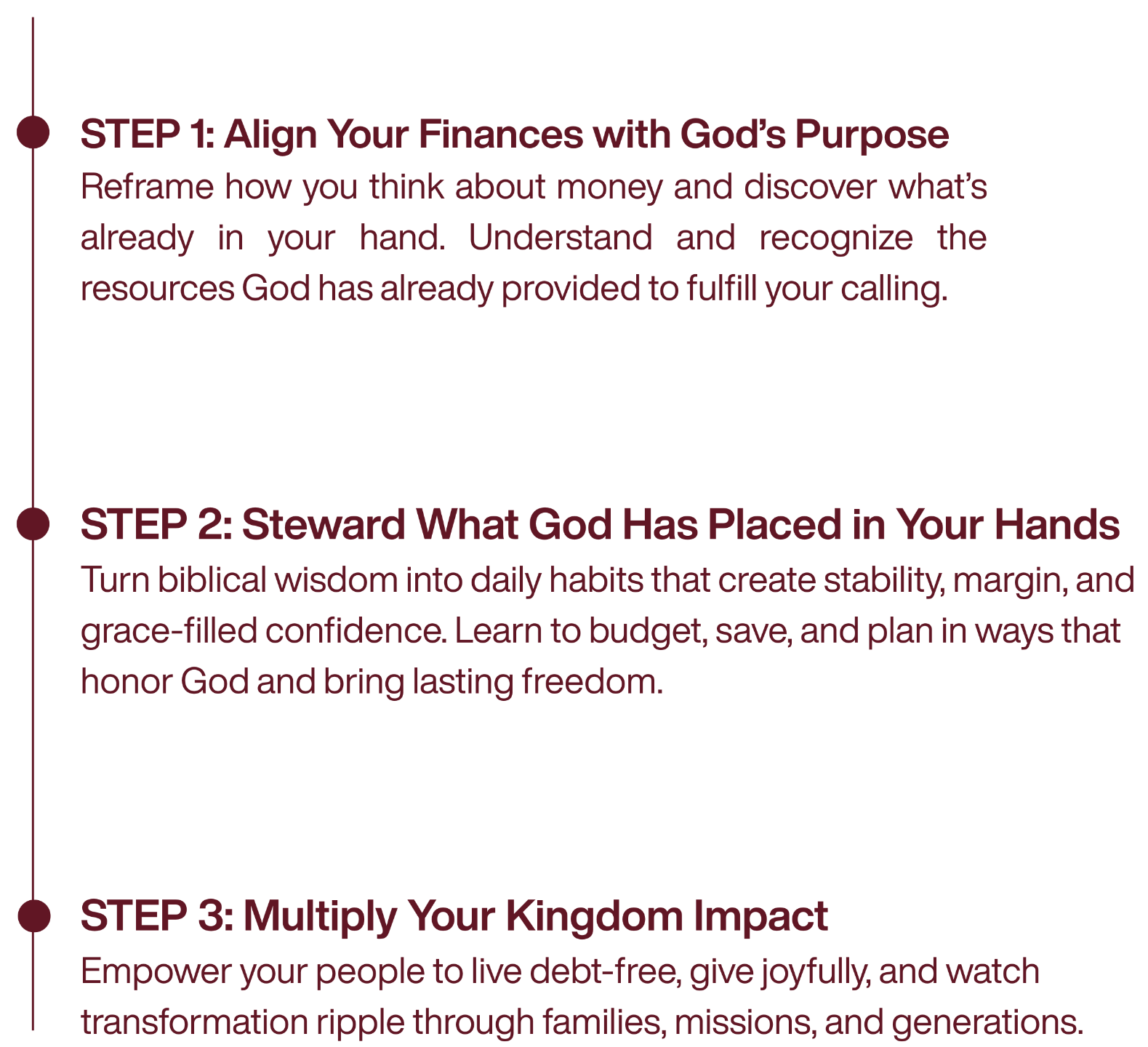 Empower your members to trust God with their finances through a framework that’s rooted in Scripture, practical for everyday life, and built to multiply across your community. -