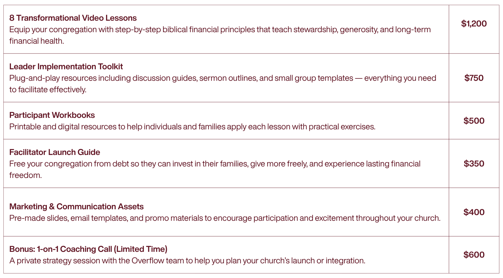 Gain access to 8 biblically grounded sessions designed to help your church members understand God’s principles for money, eliminate debt, and embrace a lifestyle of generosity.